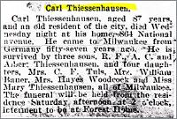 Dieser Artikel sagt aus, dass Carl Thiessenhusen ein Restaurant hatte, nachdem er nach Milwaukee kam. Hier zeigt sich, dass eine Familientradition in beruflicher Hinsicht fortsetzte. Später führte er ein Geschäft (vermutlich eine Schneiderei) und einen Saal in der National Avenue. Carl und Johanna lwohnten dort in der Hausnummer 864 nach 1860.