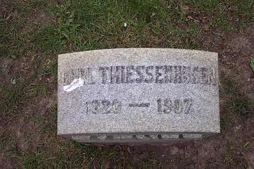 ... wanderte mit seinem Bruder Heinrich 1850 aus und siedelte sich in Milwaukee, Wisconsin an. Carl, geboren 1820 und Johanna, geboren 1833 (Pamperien) Thiessenhusen hatten 12 Kinder: Theodore, geboren April 1854 Wilhelmine, geboren Juni 1855 Ida, geboren March 1857 Alvina, geboren November 1858 Mary, geboren Juni 1861 Albertina, geboren April 1863 Rheinhold, geboren November 1865 August, geboren Oktober 1866 Edward, geboren Dezember 1869 Albert, geboren Mai 1872 Frank, geboren September 1874 und Clara, geboren Juli 1876. Carl und Johannas Familie lebte in der Stadt Milwaukee. Carl war Schneider. Beachte: Die meisten Nachkommen von Carl, Heinrich und Christoph behielten die Mecklenburger Schreibweise ihres Familiennamens bei "Thiessenhusen". Die Nachkommen von Wilhelm und Joachim änderten die Schreibweise ihres Namens in "Thiesenhusen". Zwei Familien kürzten ihre Namen auf "Thiesen". |