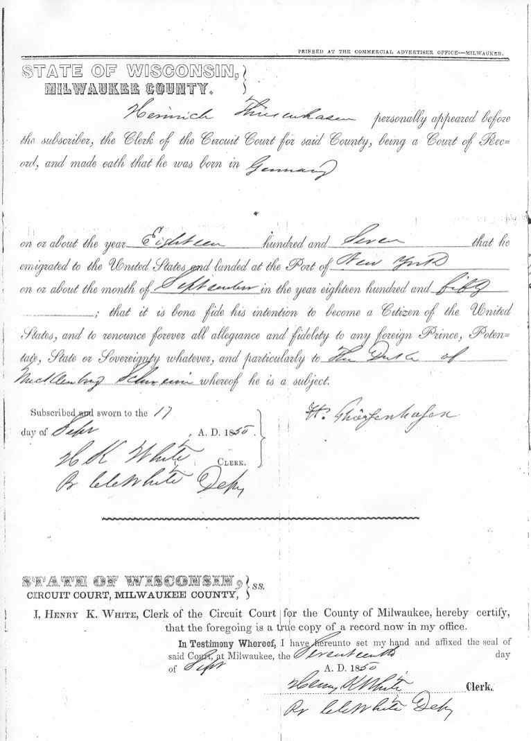 Letter of Intent from 1850 and page 2 of the Petition for Naturalization from 1856. Note his signatures. C. Kneser was a sponsor. Heinrich married Elisabeth Kneser in Germany.