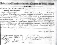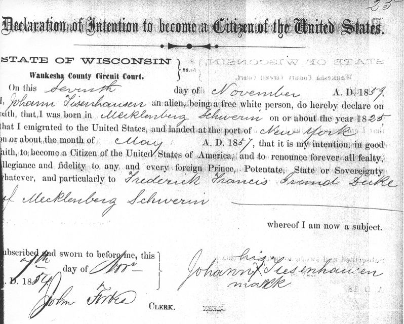 A “Declaration of Intention to become a Citizen of the United States” was filed by Joachim Johann Thiessenhusen about a year after immigrated to Wisconsin. Names and dates were not always exact, as this document makes clear. Notice that Joachim was illiterate. He signed his name with an “X” on this form.
