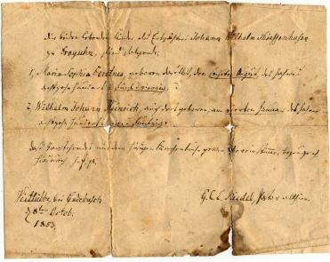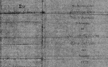 This important document is the original Permit to Emigrate that allowed Wilhelm and Elisabeth Thiessenhusen and their two children Marie and William to leave their parish. They lived in Dragun, near Rosenow in “Vietlübbe by Gadebusch” parish. Their minister G.C.L. Riedel of wrote this document on 8 October 1853 for them. He also recorded all of the Thiessenhusen baptisms, weddings, and burials in the Vietlübbe parish registers and was a census taker for the 1816 Mecklenburg Census. |