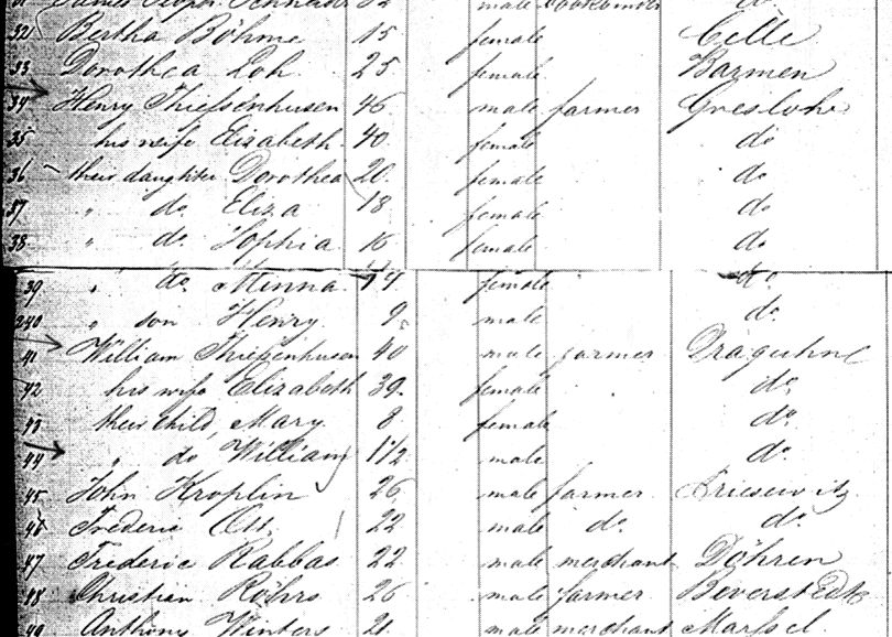 Schiffsmanifest für das Dampfschiff "Hansa" für die Reise nach New York, Ankunft 1853 In der Passagierliste findet sich Heinrich Thiessenhusen, seine Ehefrau und ihre vier Kinder, die zuvor in der Gemeinde Gressow (“Greslohe" ) lebten. Wilhelm Thiessenhusen, seine Frau und die zwei Kinder lebten vor der Auswanderung in Dragun (“Draguhn” ).