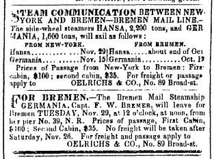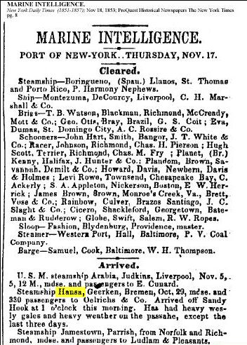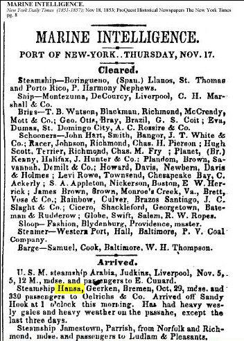 “Marine Intelligence,” 17 November 1853, “Arrived. Steamship Hansa, Geerken [captain], Bremen, October 29 [departure], with merchandise and 350 passengers to Oelrichs & Co. [broker], Arrived off Sandy Hook [in New York Harbor] at 1 o’clock this morning. Has had heavy westerly gales and heavy weather on the passage, except the last three days.” |