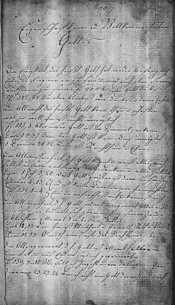 Es gibt drei Seiten in alter deutscher Handschrift. Dieses ist die erste Seite mit der Überschrift “Eigenschaften oder Vollkommenheiten Gottes” . Zu jeder dieser elf Eigenschaften gibt es Bibelverse um sie zu untermauern. Zum Beispiel: zweite von oben - Bibelvers PS 115, 3 Aber unser Gott ist im Himmel ... Es exsistiert keine andere Schrift in dieser Familienbibel , andere persönliche Notizen oder Aufstellungen über Geburten oder Todesfälle.