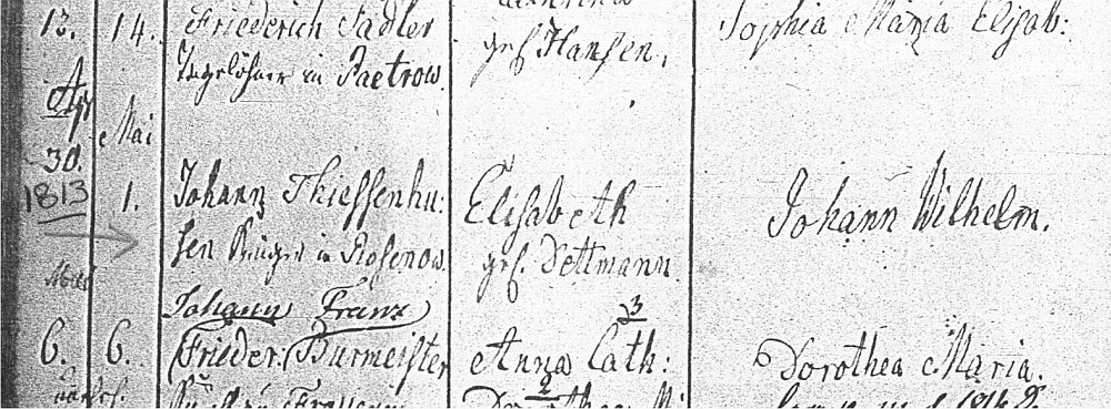 | April 30 [1813, birth] | May 1 [baptism] | Johann [Cuno] Thiessenhusen, innkeeper/landlord of Rosenow [father] | Elisabeth née Dettmann [mother] | Johann Wilhelm [child]. |