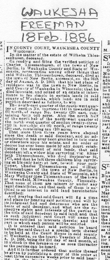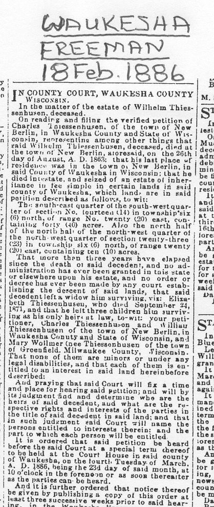 1886 Newspaper Announcement: Wilhelm Thiessenhusen Estate Settlement and Transfer: Wilhelm Thiessenhusen held the title to 50 acres of farm land in section 14 and 23 in New Berlin when he died in 1863. His wife, her new husband, and family continued to run the farm after his death.