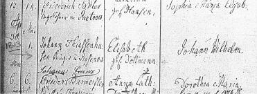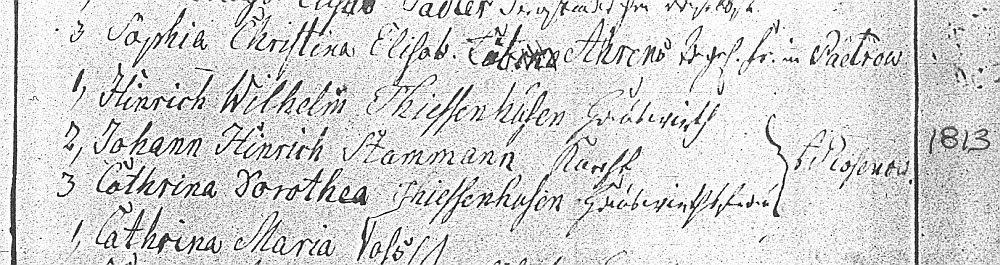 The sponsors at Johann Wilhelm’s baptism were: 1.) Heinrich Wilhelm Thiessenhusen, 2.) Johann Heinrich Stammann, and 3.) Catharina Dorothea Thiessenhusen all of Rosenow. |