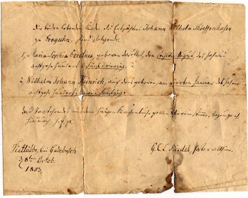 Vietlübbe, bei Gadebusch G.C.L. RIEDEL, Pastor allhier d. 8 (?)ten Octob. 1853