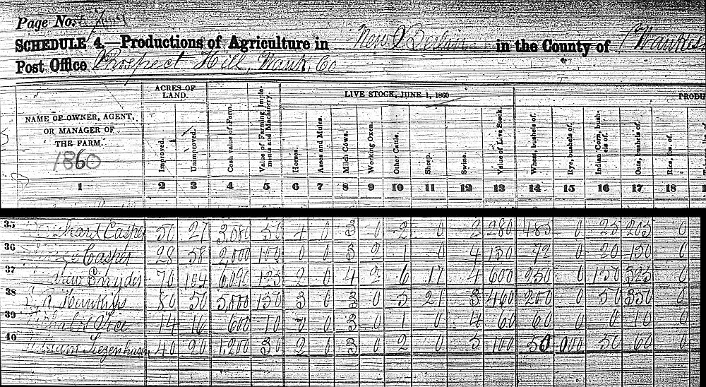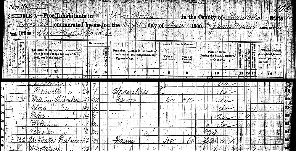 Wilhelm Thiessenhusen, Tierzählung in Wisconsin. 1860 Zeile 40: Wilhelm Thiessenhusen gehören 24 ha, 2 Pferde, 3 Milchkühe, 2 Rinder und 5 Schweine. Er baute Weizen, Mais und Hafer an. Sein Bauernhof hatte einen Wert von $1,200 (2003: $25,500). Als Wilhelm 1863 starb, ging das Besitztum an seine Frau Elisabeth. Sie heiratete J.J.H. Garbe 1864, der Besitz wurde ihm übertragen.
