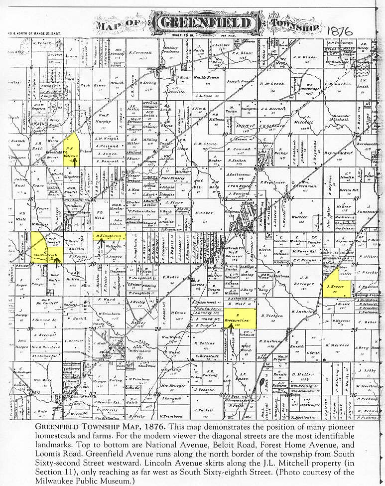 Greenfield Township, Milwaukee County, Wisconsin - Map 1876: The Peter N. Wollmer family farm is in section 8 (this is just east of the juncture of Oklahoma Avenue and National Avenue now). Peter N. Wollmer is Marie Thiesenhusen Wollmer’s father-in-law.