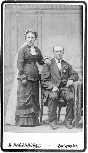 William Thiesenhusen, the middle child of Wilhelm and Elisabeth Flägel Thiesenhusen, married Henricka Garbe, daughter of Carl and Anna Kruth Garbe, in Waterford, Racine County, Wisconsin on 7 April 1880. The back of photo shows the photographer’s name and address: Louis Hagendorff, 164-6 Reed Street, Milwaukee, Wisconsin. |