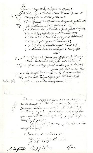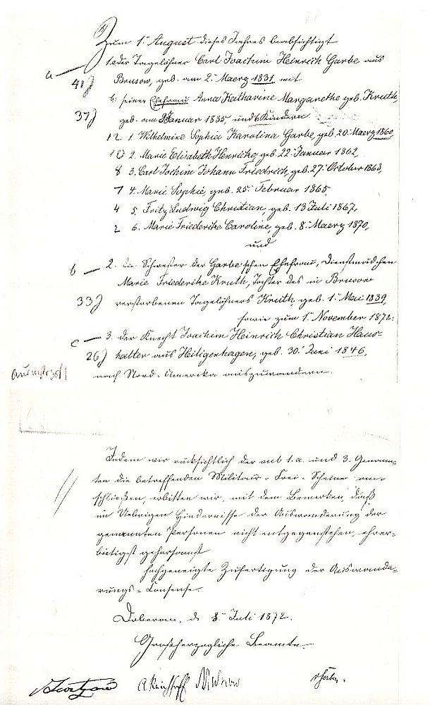 A permit to emigrate was needed to go to North America. This document was prepared by the Mecklenburg-Schwerin Ministry of the Interior on 6 July 1872 in Doberan. It names all members of the Carl Joachim Heinrich Garbe family, and two other individuals, in three groups. They planned to leave on 1 August 1872. Maria Elisabeth Henricka “Ricka” Garbe, born 22 January 1862, is listed as the second person in group “a.” She became William Thiesenhusen’s wife. Marie Kruth in group “b” is Anna Kruth Garbe’s sister, future wife of Carl Garbe’s brother Johann Joachim Heinrich Garbe. |