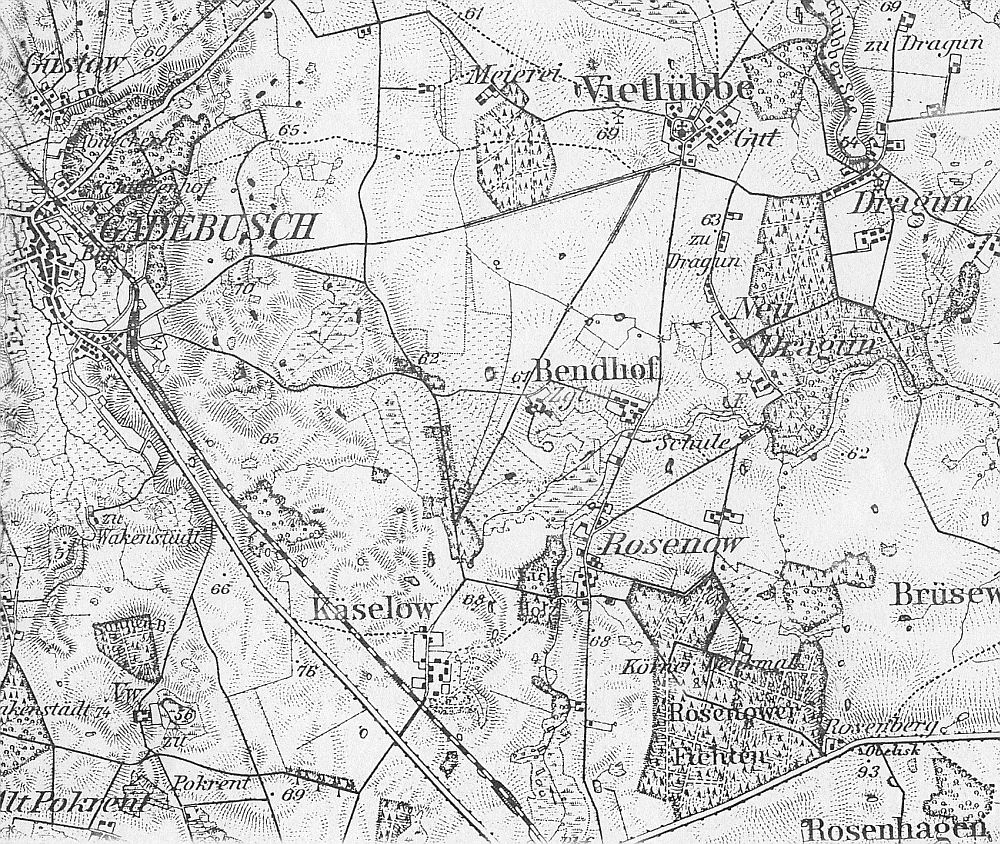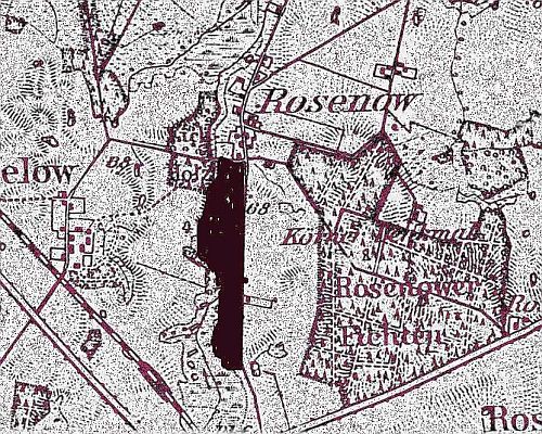 Das dunkle Gebiet zeigt den Ort, wo die Thiessenhusens von 1770 bis in die 1900er lebten, einst bekannt als "Hufe V". Er befindet sich südlich von der Mitte Rosenows, Nähe Käselow.