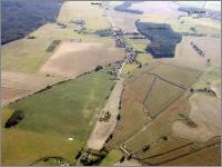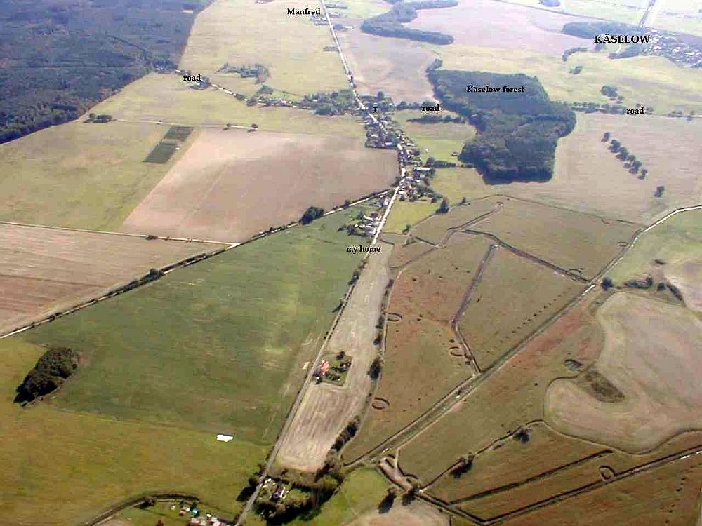 The village of Rosenow is just below #1. The site of the first Thiessenhusen home known as “Hufe V” is marked “Manfred,” home of Manfred Thiessenhusen. The “road” is the old route from Schwerin in the southeast to Lübeck and Hamburg in the northwest.“My home” is the home of Werner Möller, who took this recent photo from a hot air balloon.